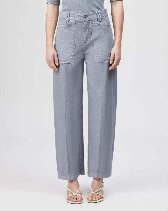 DERIVE ist eine verkürzte Hose mit Barrel Leg und modernen, aufgesetzten Taschen. Die Baumwoll-Leinen-Ware hat einen weichen Griff und ein sommerlich, leichtes Tragegefühl.