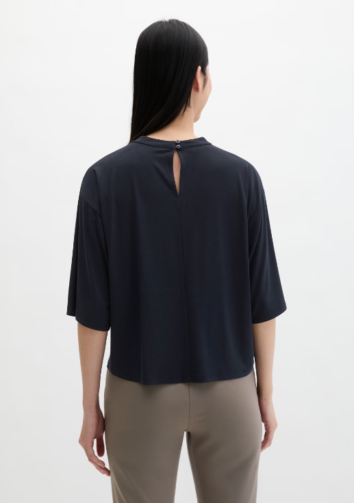 Die perfekte Alternative zu klassischer Bluse und Basic-T-Shirt: das feminin designte Blusenshirt aus weichem Viskose-Stretch-Jersey. Mit wenigen Stylingregeln lässt sich das Modell vielseitig kombinieren – von lässig bis elegant ist alles möglich. Es hat eine lockere, bequeme Passform mit schmalem Stehkragen, Schlüsselloch-Detail im Nacken, angeschnittenen, weiten Dolman-Ärmeln und geradem Saum. Der Allrounder ist perfekt für die kommende Saison und lässt sich lässig im Half-Tuck-Stil tragen – einfach vorne locker in den Bund von Hose oder Rock stecken!