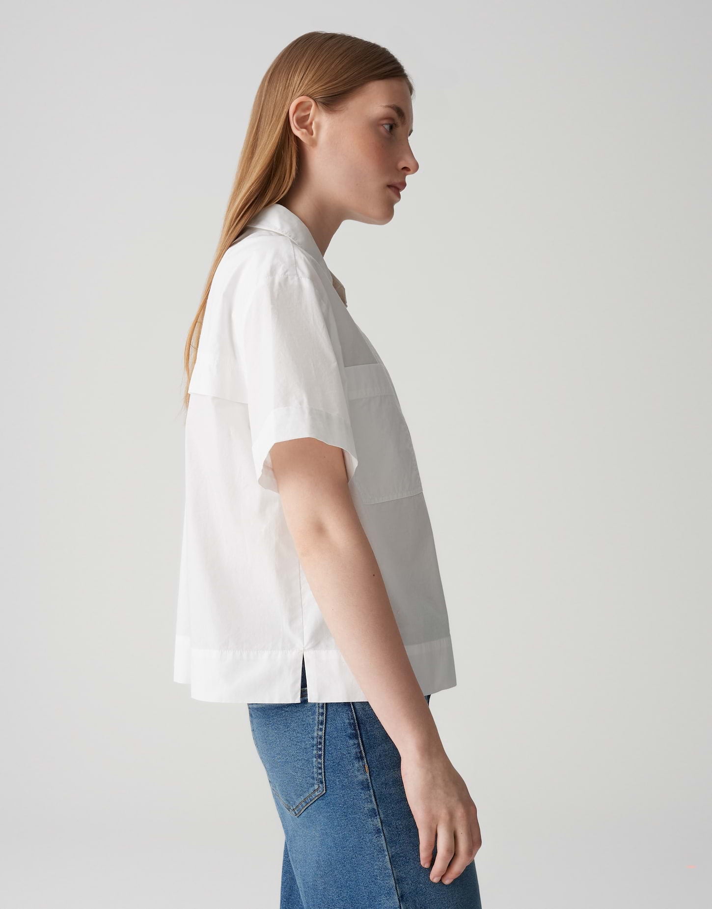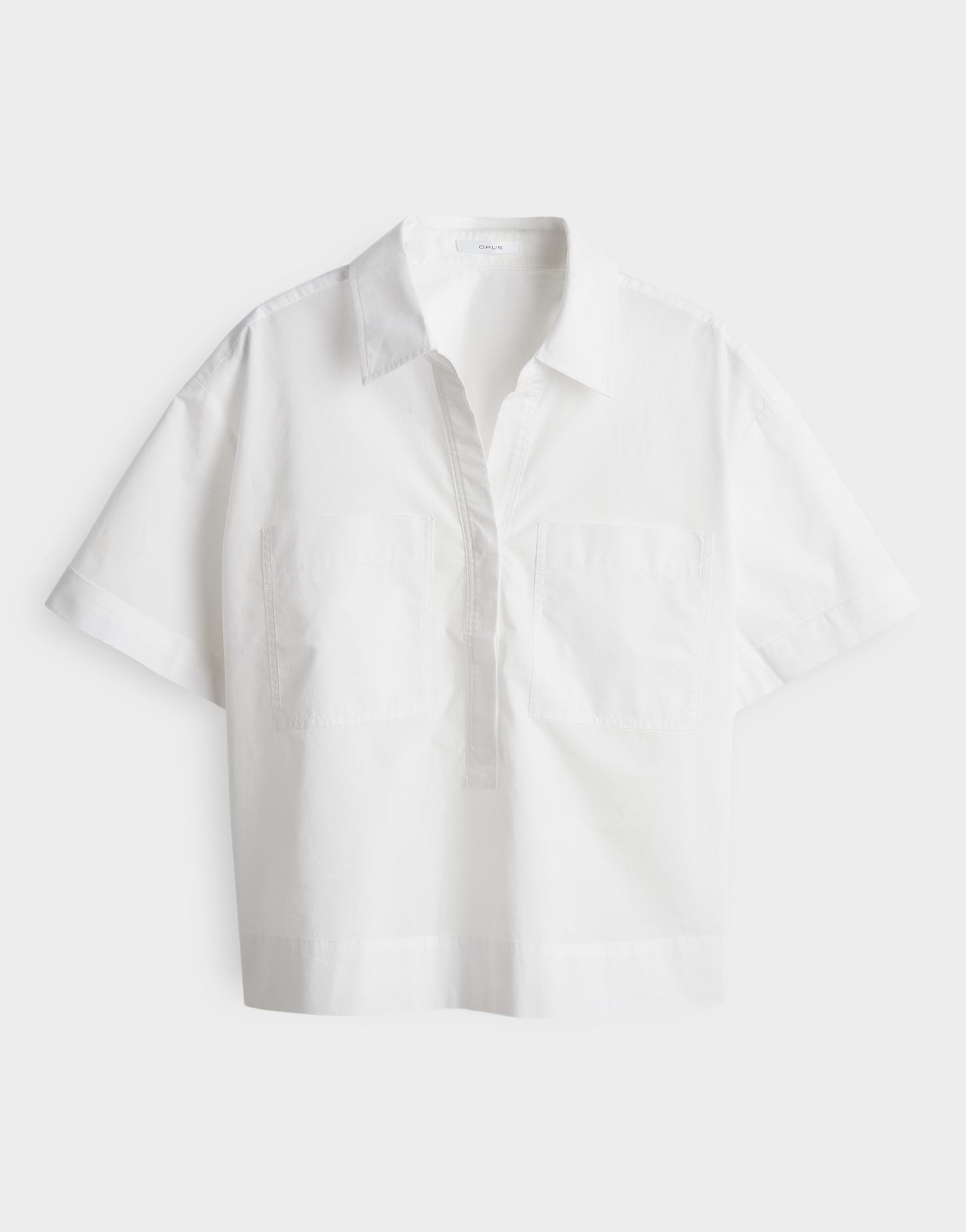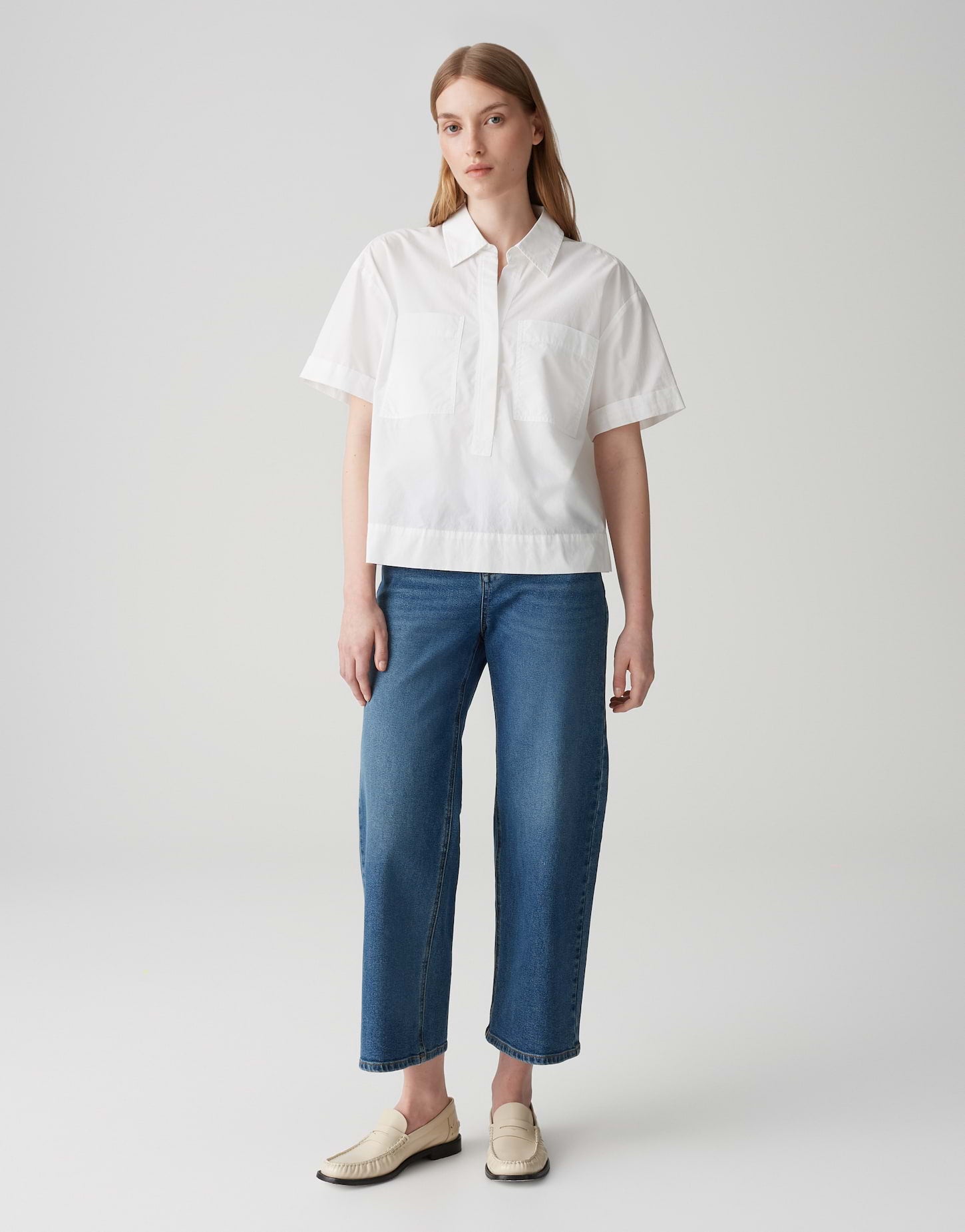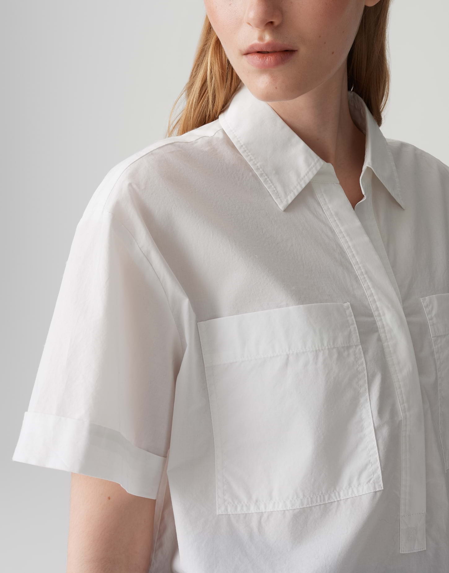 Die Boxy Kurzarm Hemdbluse aus hochwertiger Baumwoll Popeline begeistert mit verkürztem Schnitt und raffinierten Details. Ein vielseitiger Begleiter ob im Business, als auch für angezogene Alltagsstylings.