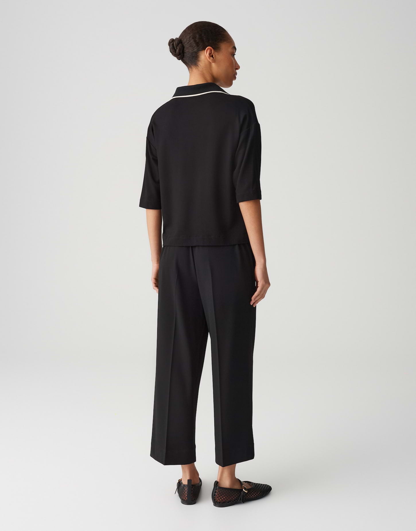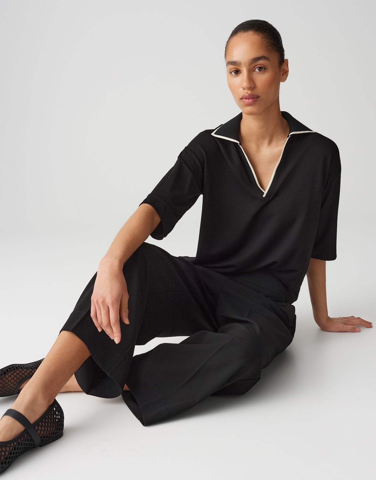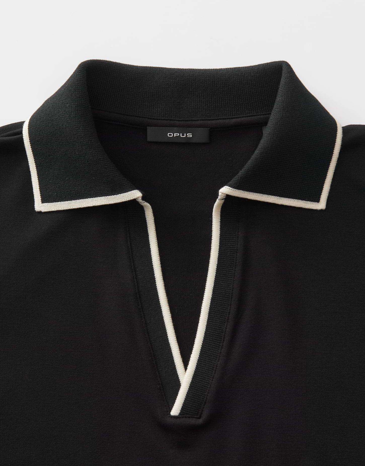 Business trifft College Flair! Das Jerseyshirt mit Polokragen samt Kontraststreifen bringt frische Dynamik in jeden Look und macht das Spiel zwischen Lässigkeit und femininen Chic zum modischen Highlight.