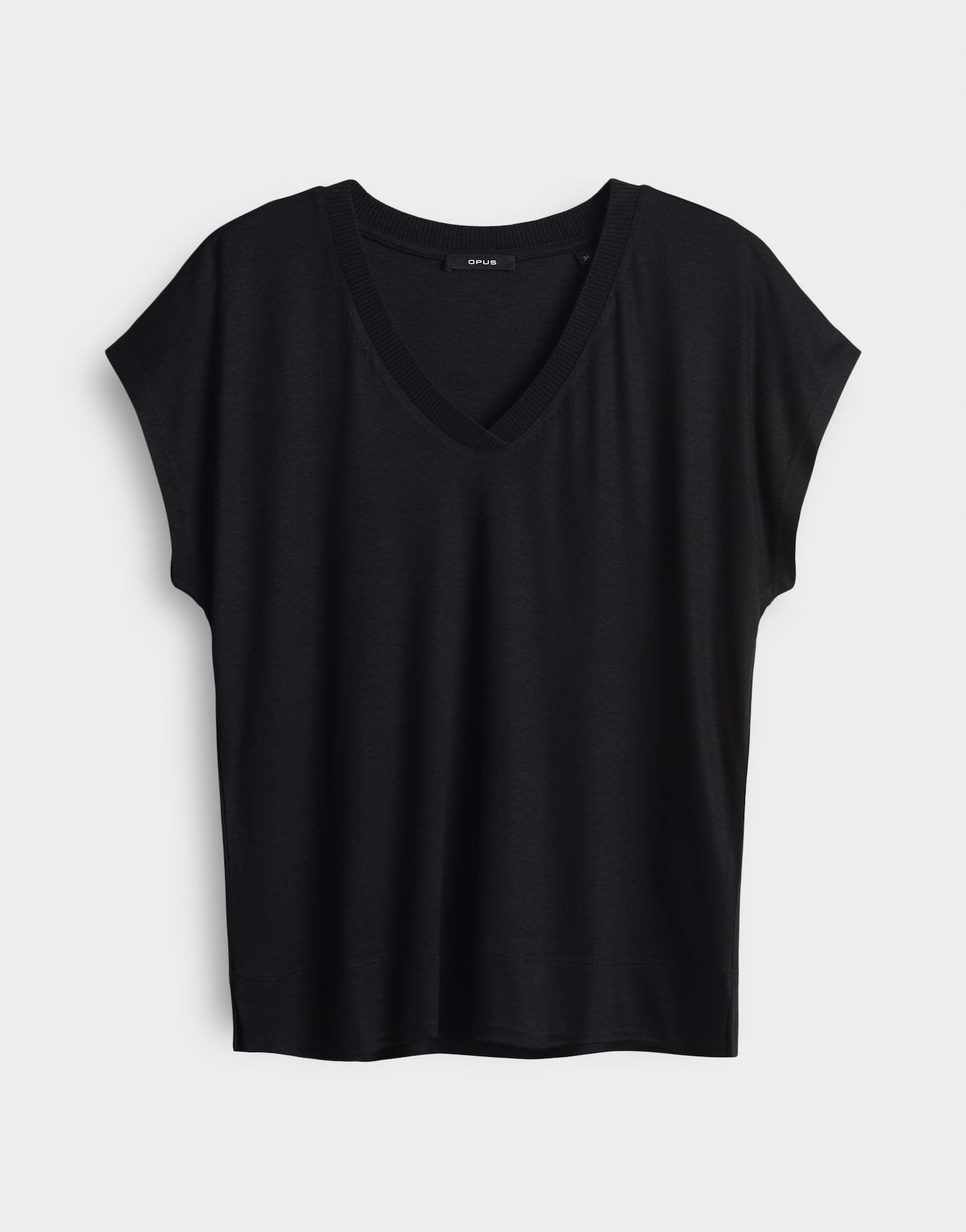 Lässig geschnittenes V-Neck Jerseyshirt aus weicher leicht schimmernder Viskose umspielt sanft die Silhouette und wird zum vielseitigen Styling Allrounder für jeden Tag.