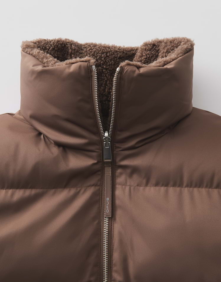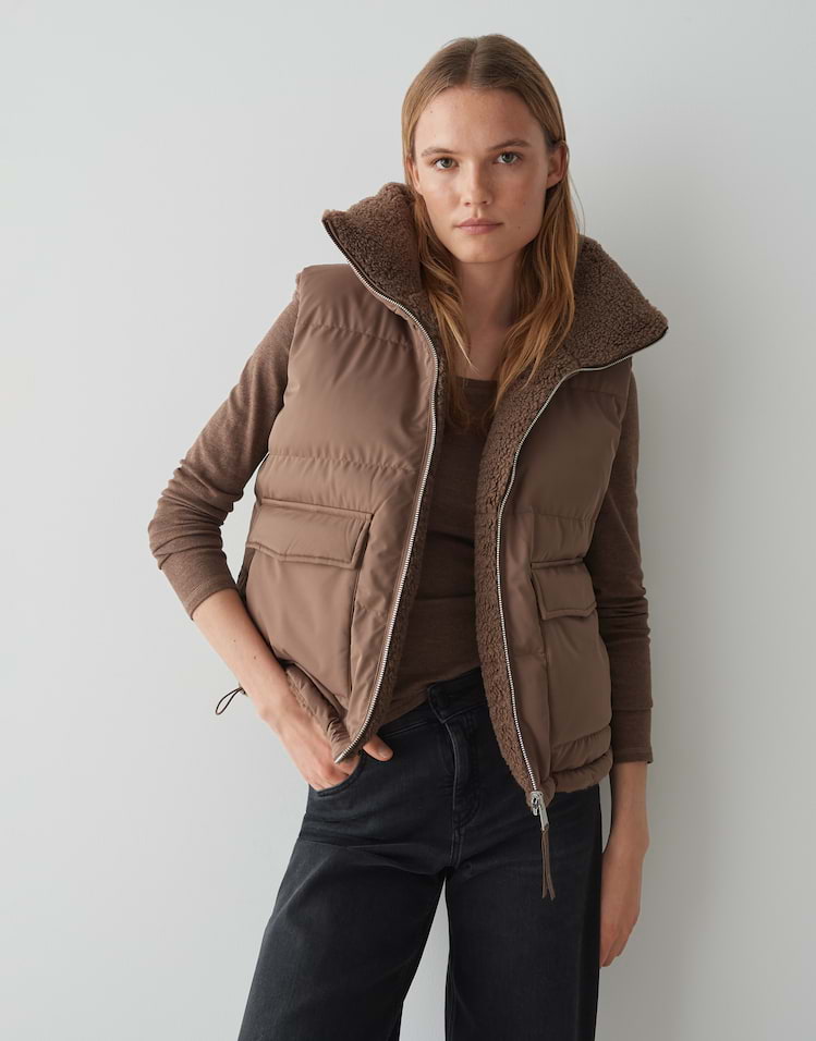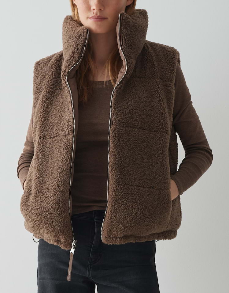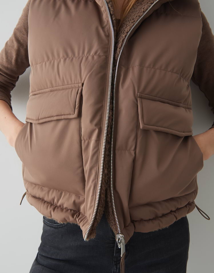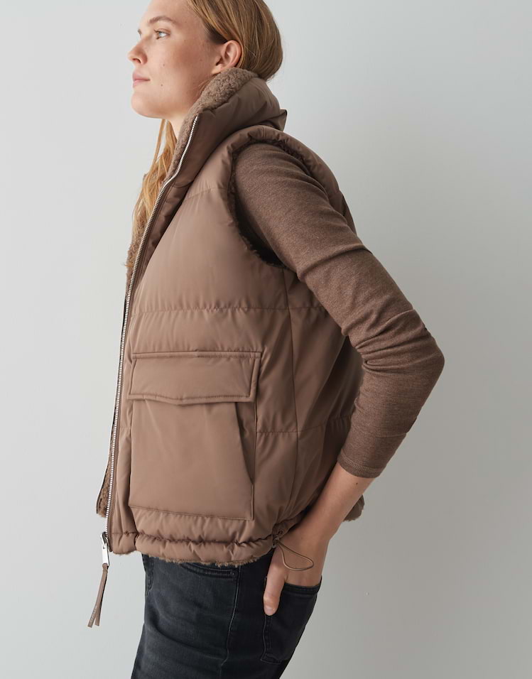 Zwei Looks in einem machen die wendbare Steppweste zum Highlight, denn sie begeistert mit kuscheliger Teddyseite und glatter wasserabweisender Oberfläche. Ob soft und wärmend oder wetterfest getragen, passt sich diese Weste jeder Wetterlage an.